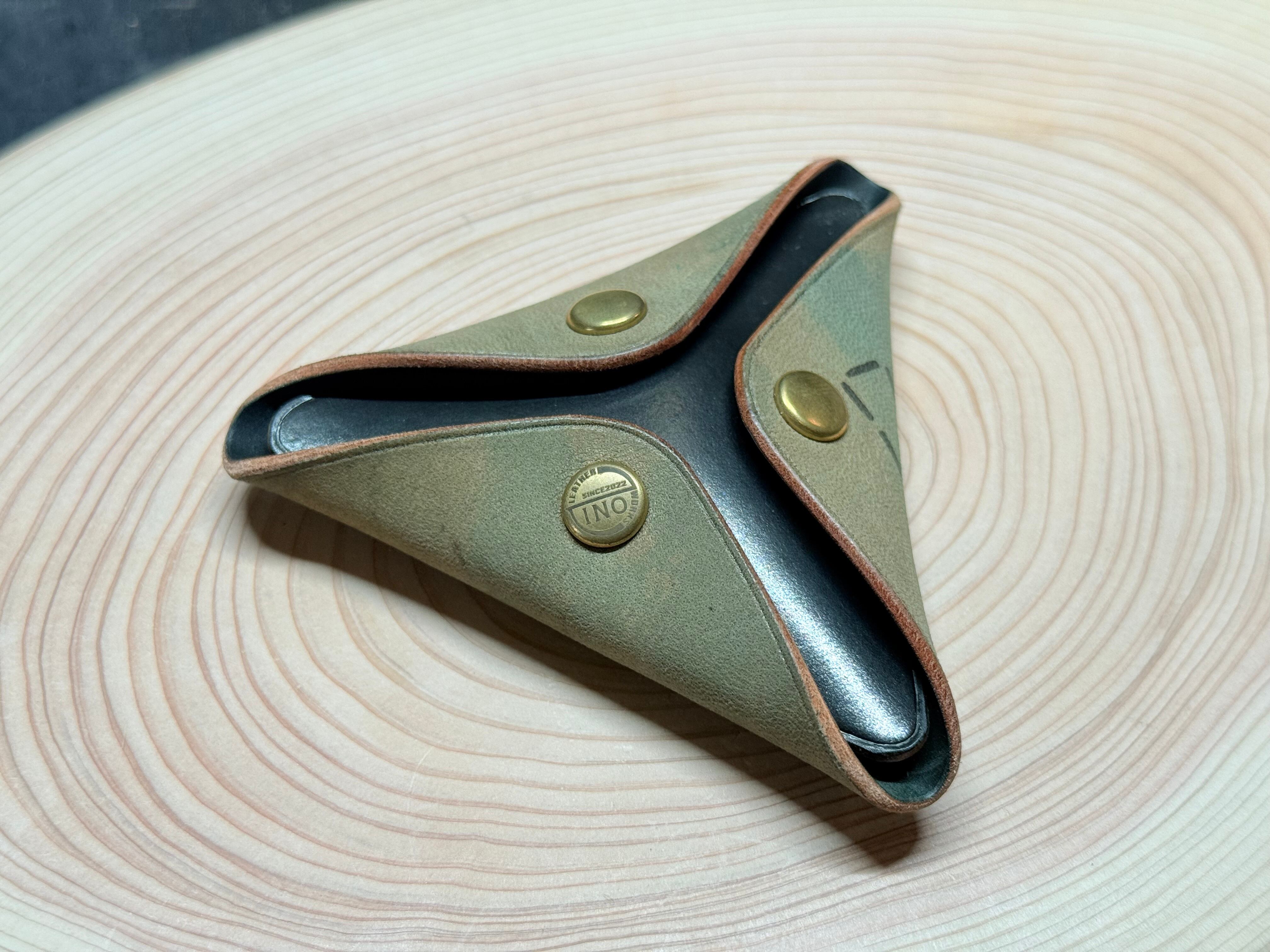 三角ミニポーチは、革小物で定番品のスクエアコインケースを三角形でデザインした珍しい形が特徴のレザーポーチです。ユニークな三角形のフォルムが目を引き、シンプルながらも存在感のあるアイテムとなっています。さまざまなシーンで活躍し、持ち運びにも便利です。