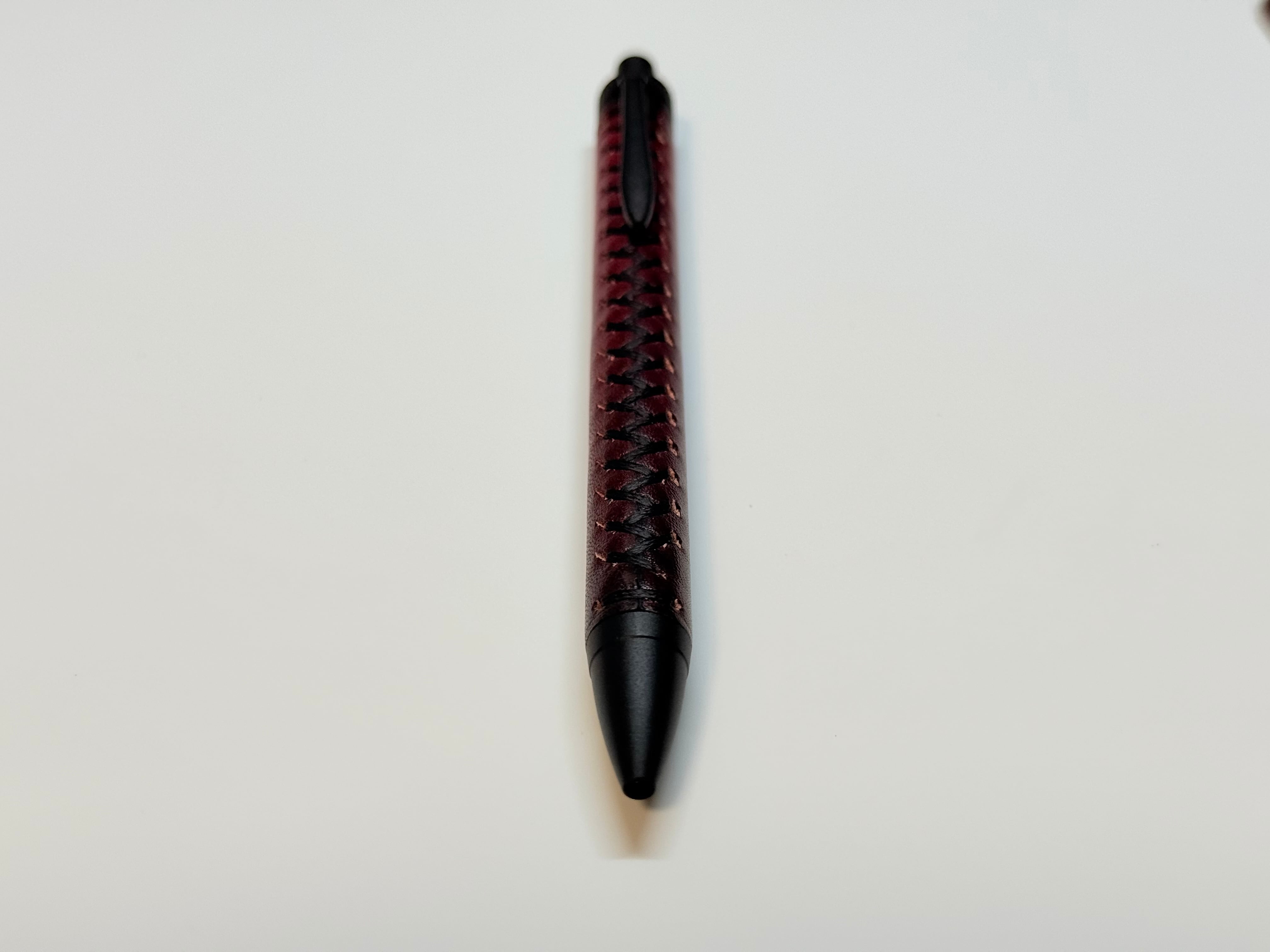 糸は耐久性の高いポリエステルの編織平糸を使用し、ペンに指が触れる方向を考慮しているため指に糸が触れたときの違和感を極力感じにくくしたオリジナルのステッチを施しています。