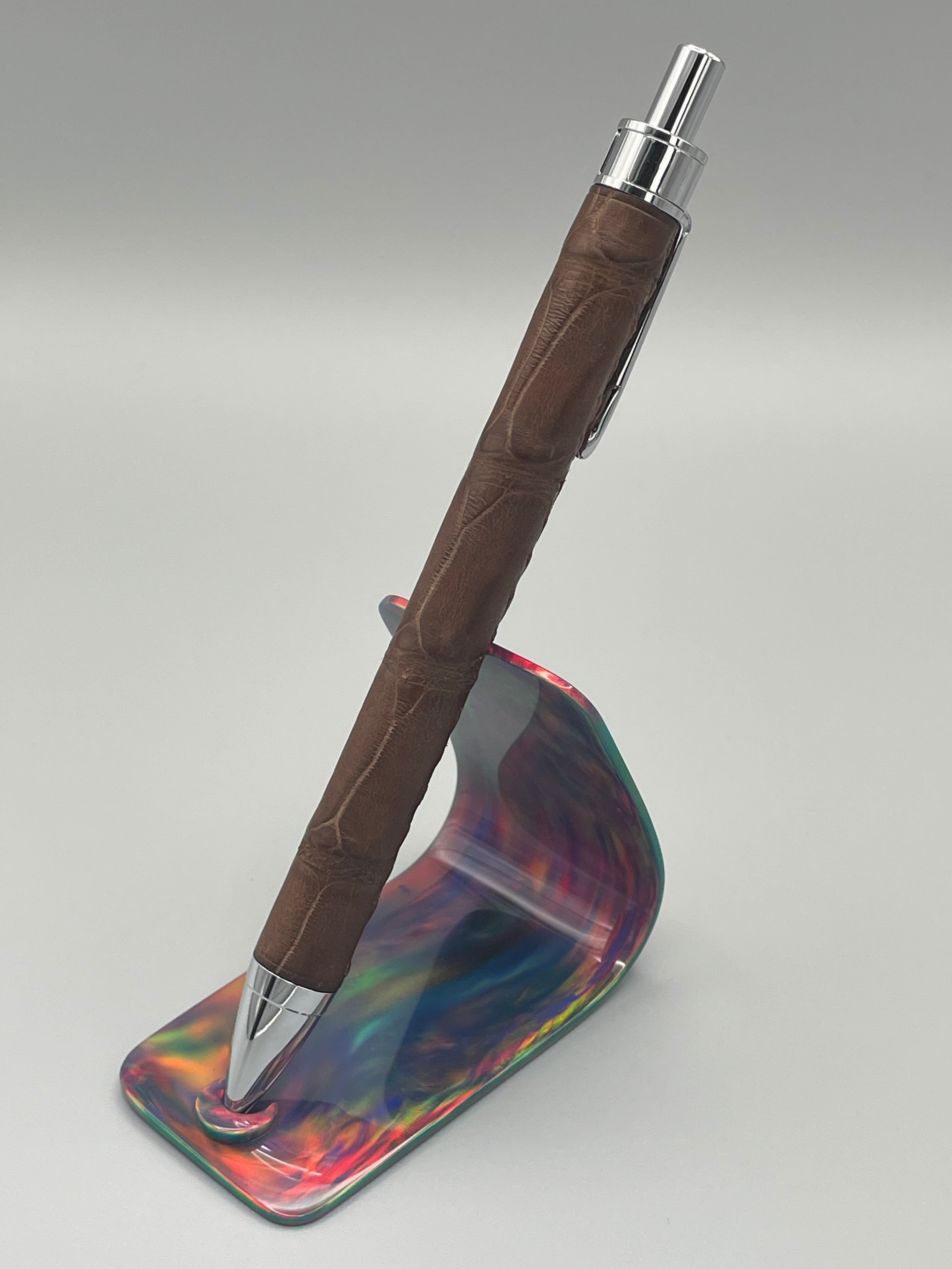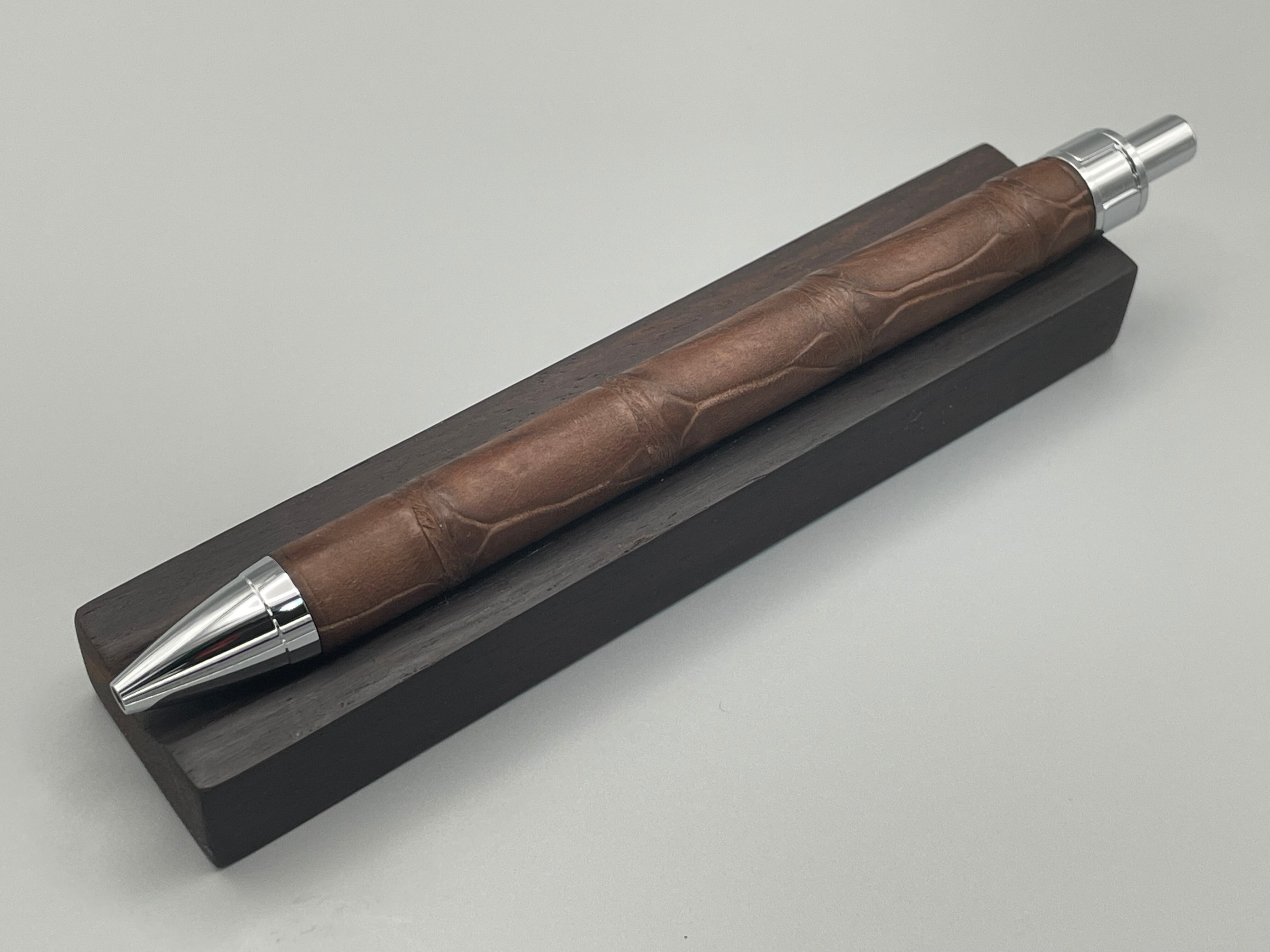 クロコダイル革でペンを製作しました。尻尾の腹側の部位を使用しています。鱗模様は全く同じものは存在しないため、所有欲も満たせる逸品となっております。