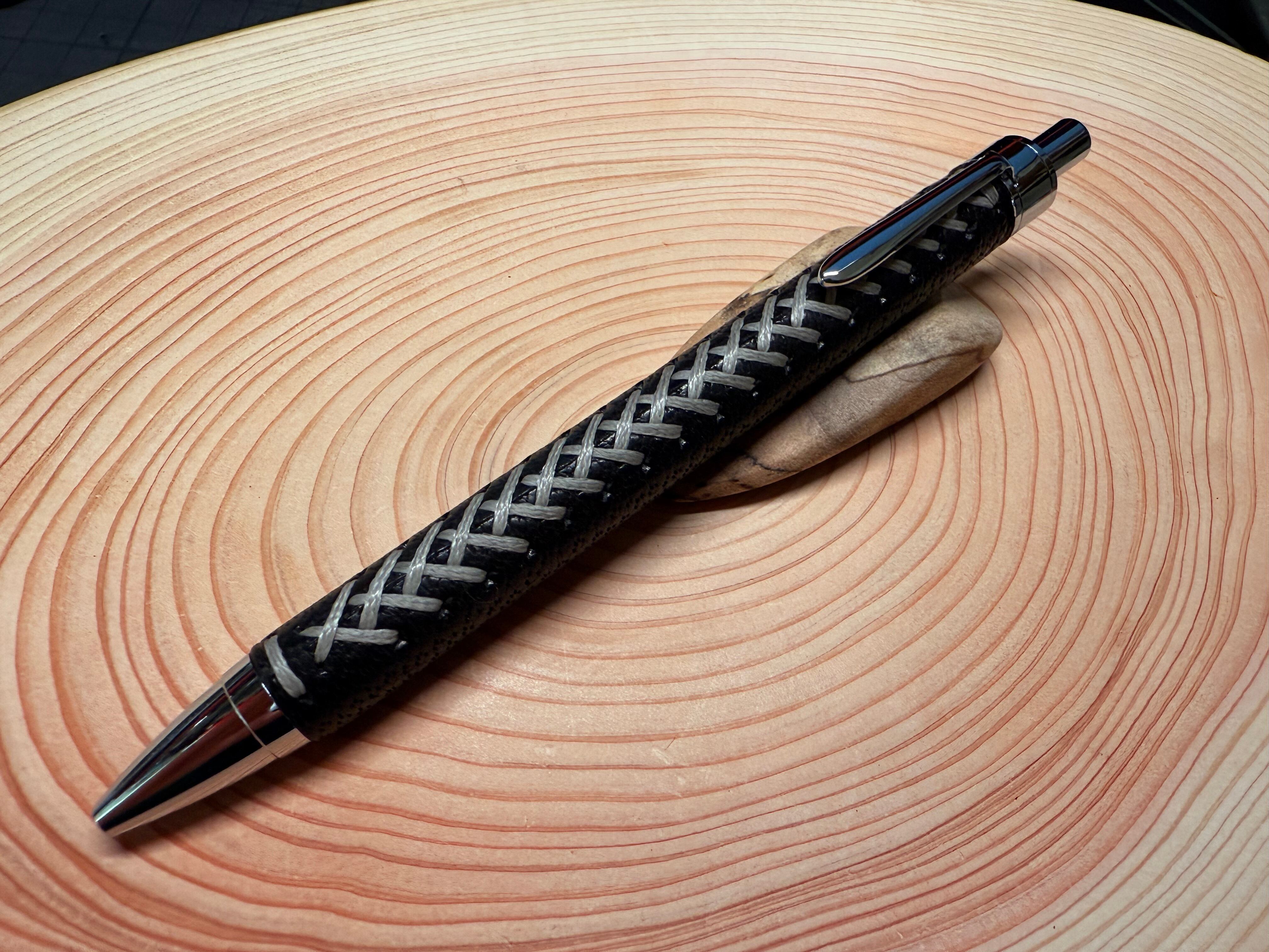 糸は耐久性の高いポリエステルの編織平糸を使用し、ペンに指が触れる方向を考慮しているため指に糸が触れたときの違和感を極力感じにくくしたオリジナルのステッチを施しています。