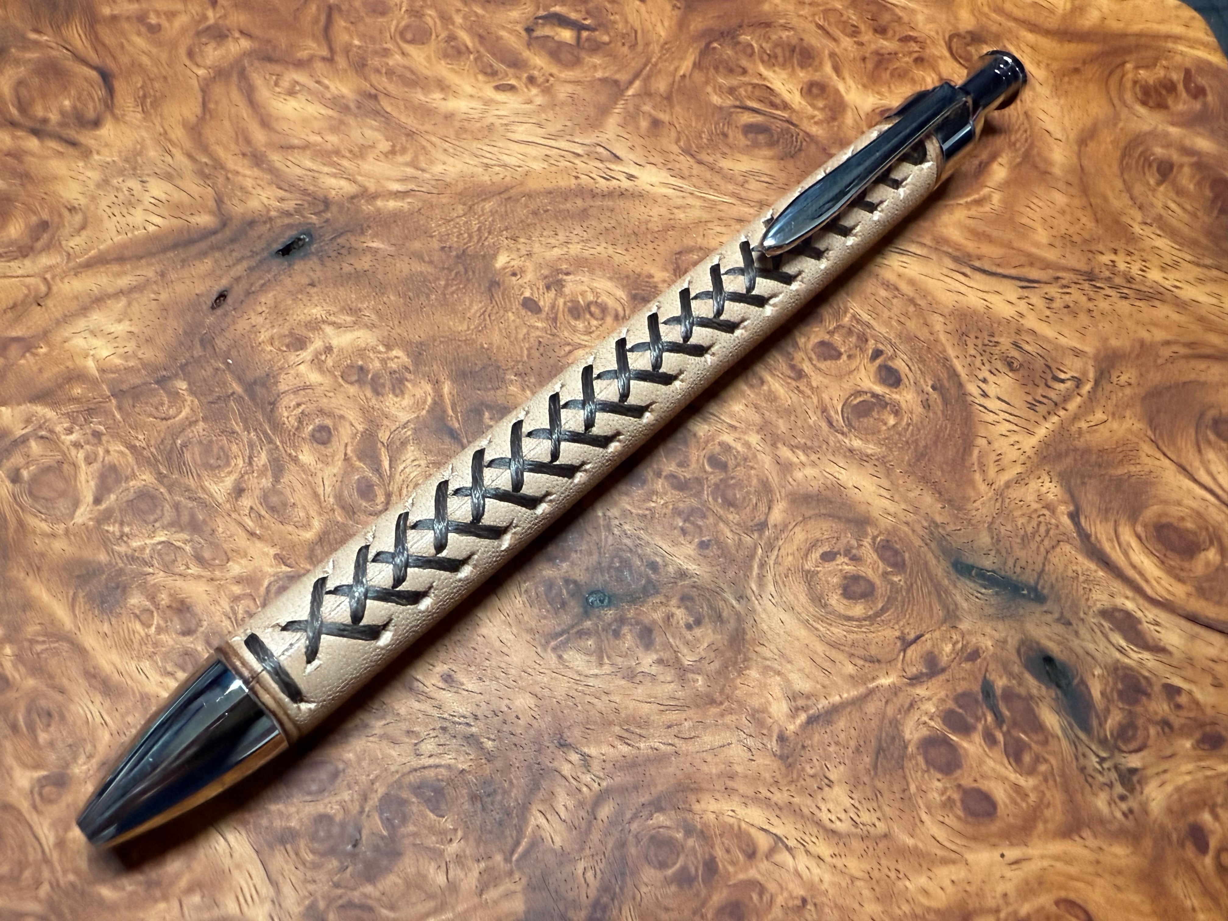 糸は耐久性の高いポリエステルの編織平糸を使用し、ペンに指が触れる方向を考慮しているため指に糸が触れたときの違和感を極力感じにくくしたオリジナルのステッチを施しています。